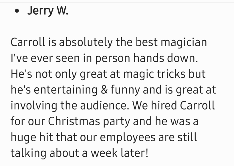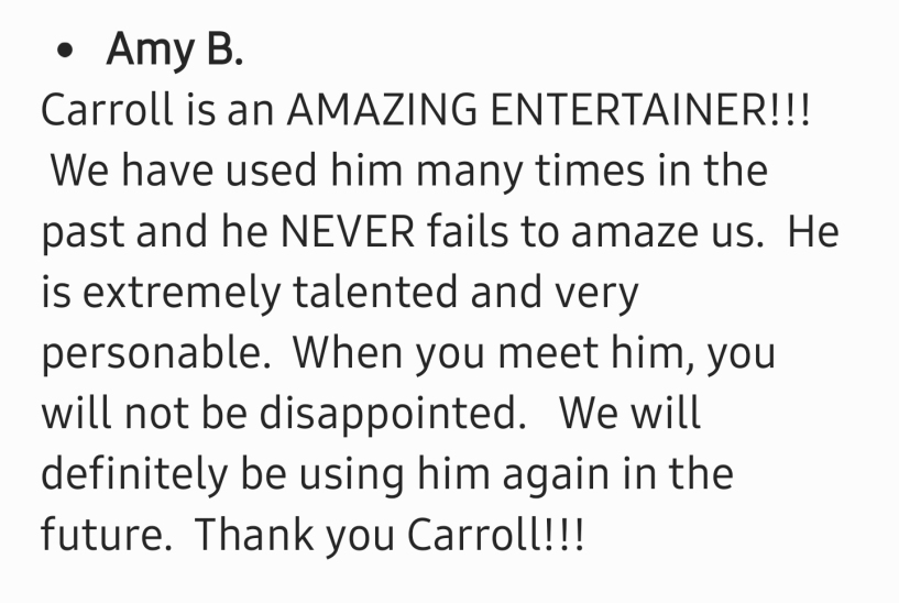 Performing in over 2000 shows over my lifetime, I have helped many event planners look like the real stars of the event by hiring me as the entertainment with my 100% money-back guarantee. Simply put, if your guests don't enjoy my show, you pay nothing. In my lifetime of performing, I've never had anyone use it.