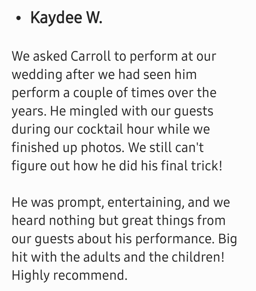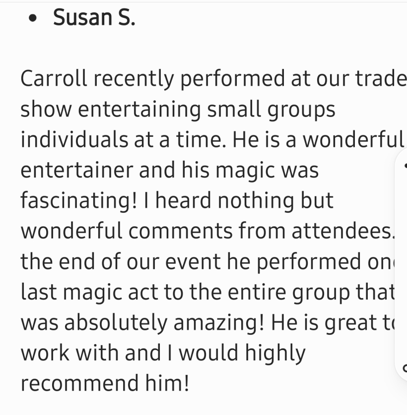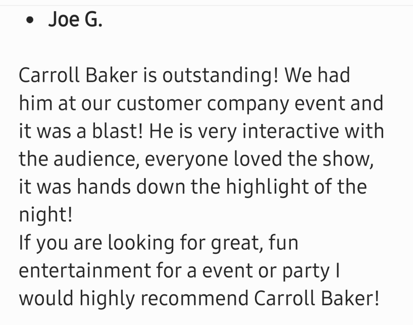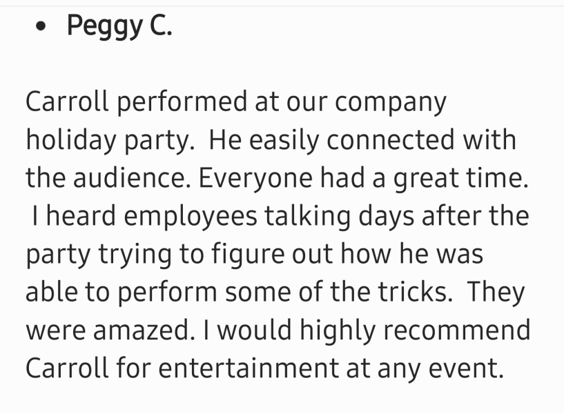 Performing in over 2000 shows over my lifetime, I have helped many event planners look like the real stars of the event by hiring me as the entertainment with my 100% money-back guarantee. Simply put, if your guests don't enjoy my show, you pay nothing. In my lifetime of performing, I've never had anyone use it.